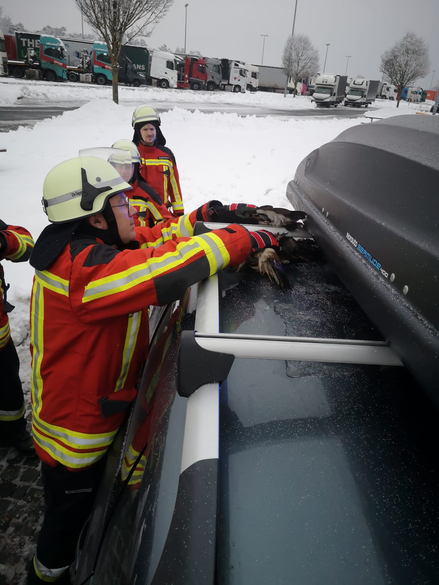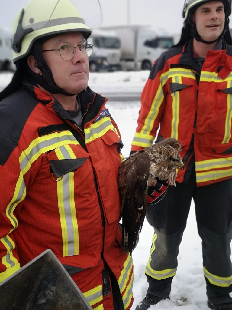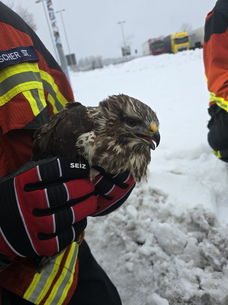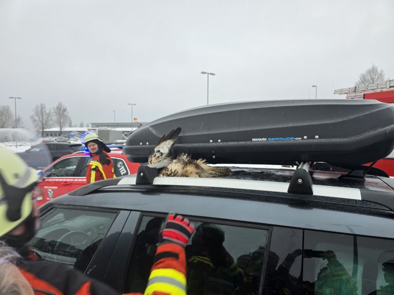 Direkt im Anschluss der beiden im Vorfeld abgearbeiteten Einsätze (Einsätze Nr. 15 u. 16) wurden wir abermals von der Leitstelle auf direktem Weg auf die Tank- und Rastanlage Fränkische Schweiz / Pegnitz zu einer Tierrettung beordert. Dort angekommen fanden wir einen PKW vor, auf dessen Dachträger ein Greifvogel eingeklemmt war und sich ohne fremde Hilfe nicht hat befreien können. Mit ein paar geschickten Handgriffen befreiten wir das Tier und übergaben es, im Beisein der ebenfalls anwesenden Polizeibeamten der VPI-Bayreuth, an einen anwesenden Jäger, der sich dem Tier annahm.