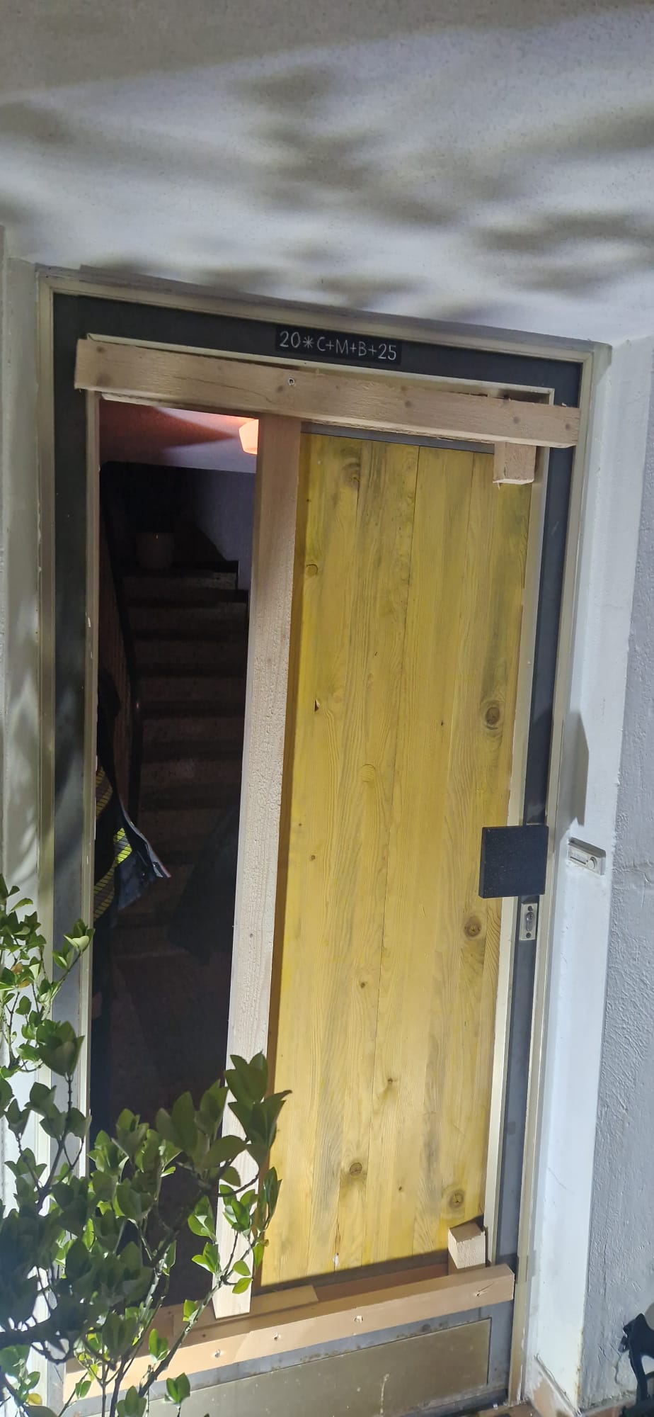 Beamte der Pegnitzer Polizeiinspektion baten uns eine duch Vandalismus zerstörte Hauseingangstüre zu sichern. Wir kamen der Bitte gerne nach und verschalten die Türe.