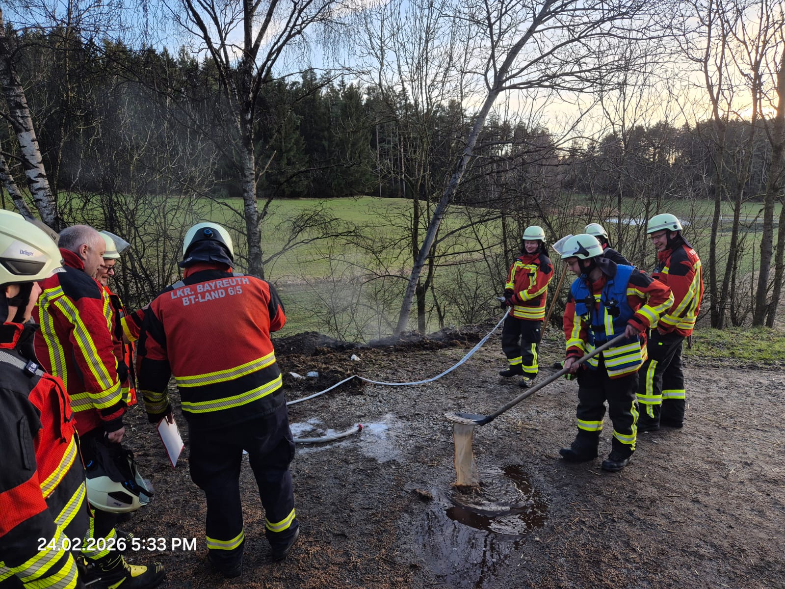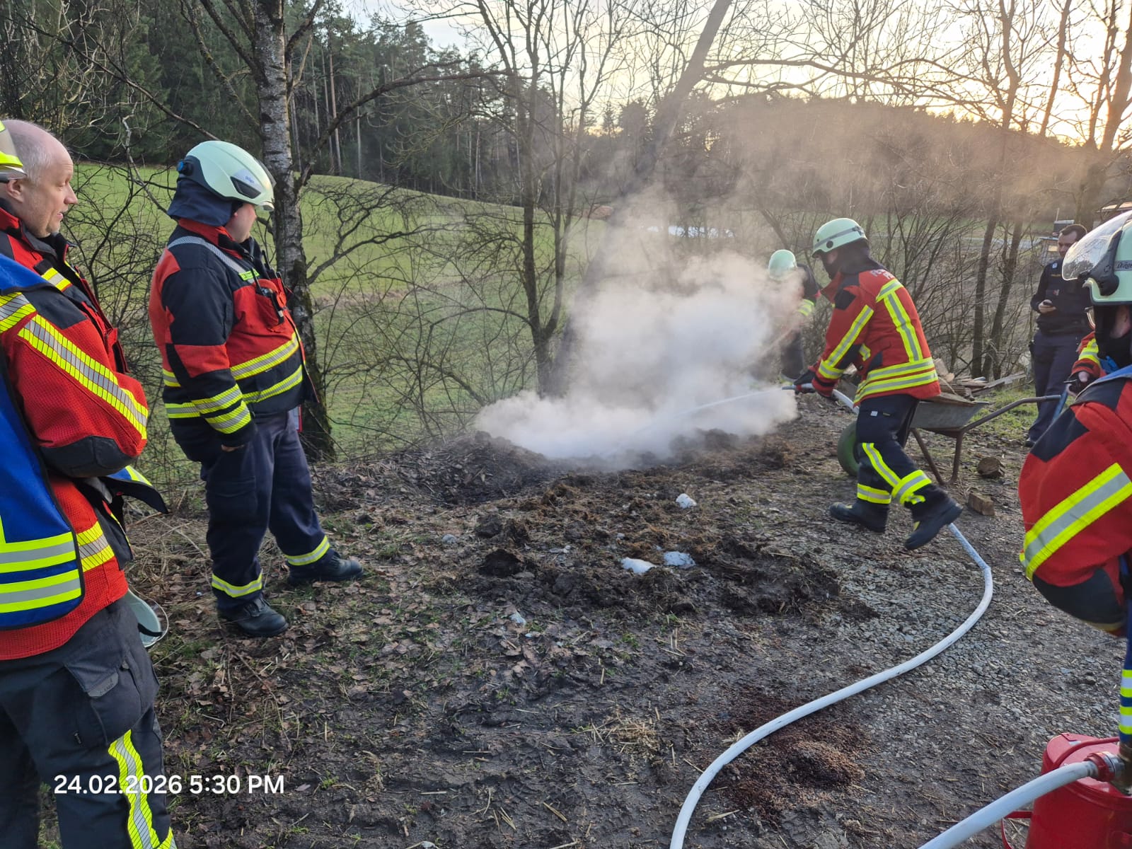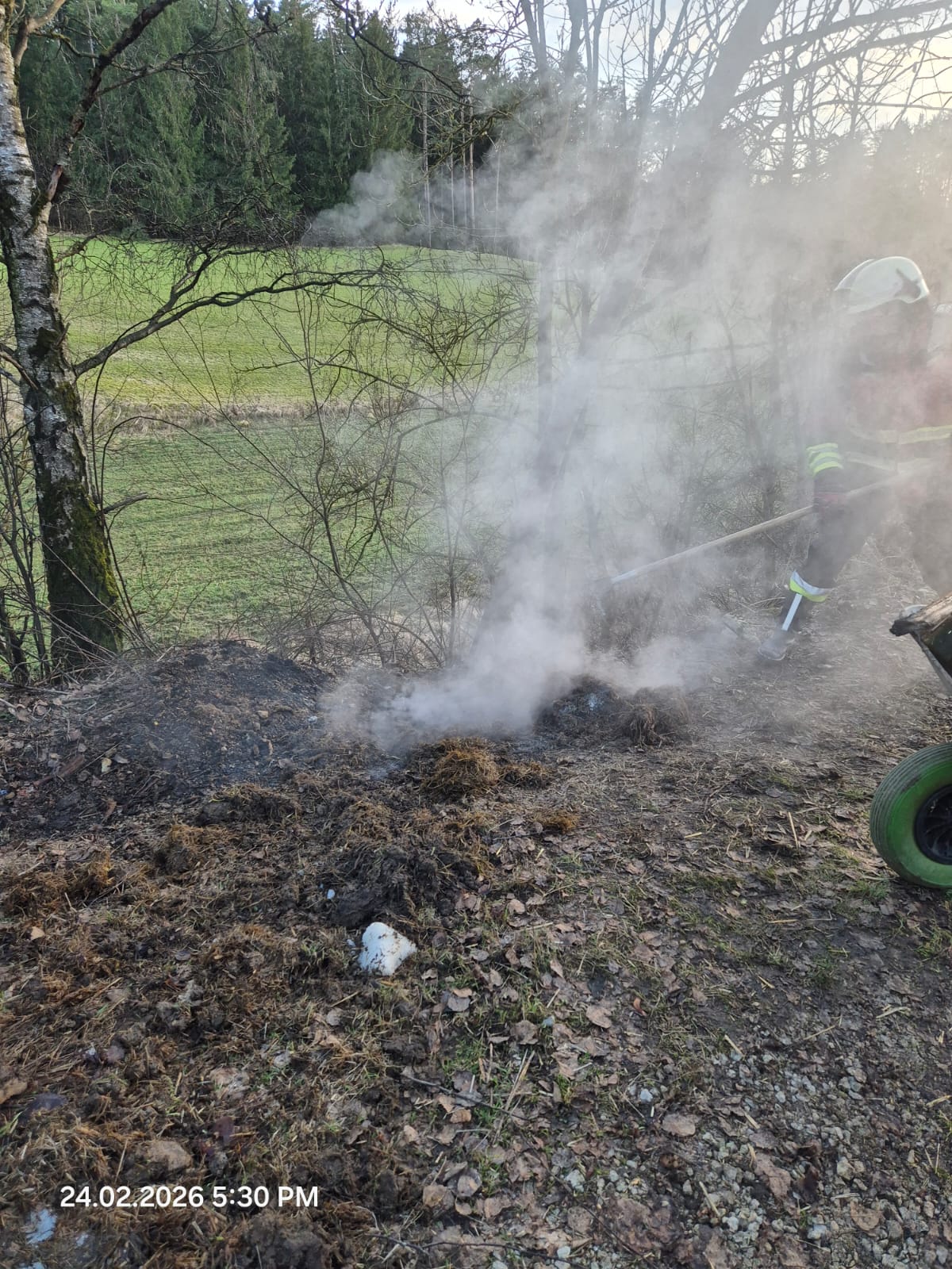 Am frühen Dienstagabend wurden wir alarmiert, nachdem eine Passantin während eines Spaziergangs eine deutlich wahrnehmbare Rauchentwicklung in Richtung eines nahegelegenen Bauernhofes festgestellt hatte und daraufhin ordnungsgemäß den Notruf 112 wählte. Beim Eintreffen unseres Kommandowagens sowie dem Hilfeleistungslöschgruppenfahrzeuges führte die umgehende Erkundung durch den Gruppenführer sowie dem Einsatzleiter schnell zur Feststellung, dass es sich nicht um ein Schadensfeuer handelte, sondern um einen stark rauchenden Misthaufen auf dem landwirtschaftlichen Anwesen. Eine Gefahr für Personen oder Gebäude bestand nicht, sodass rasch Entwarnung gegeben werden konnte.