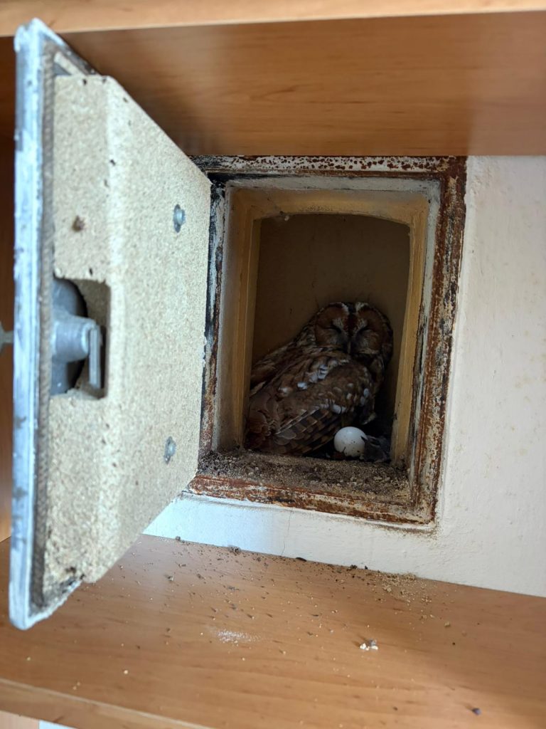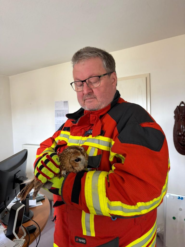 Am Sonntagmittag wurden wir zu einer Kleintierrettung in den Ernst Böhm Weg alarmiert. Eine Anwohnerin hatte der Leitstelle mitgeteilt, dass sie der Meinung sei, dass sich eine Eule oder ein Kauz in ihrem Kamin befinden würde. Nach unserem Eintreffen an der Einsatzstelle konnten wir den Eindruck der Anwohnerin bestätigen. Wir öffneten die Kaminkehreröffnung und staunten nicht schlecht als uns gleich 2 Augenpaare ansahen. Wir befreiten die beiden Tiere aus ihrer beklemmenden Lage und holten uns Hilfe bei einer eilig herbeigerufenen Falknerin. Zusammen suchten wir einen Veterinär auf, der die Unversehrtheit der Käuze feststellte und auch der Meinung war, dass sich die Tiere in einem allgemein kräftigen und gesunden Zustand befinden würden. Die Falknerin nahm sich der Tiere an und lies sie am selben Abend noch frei.