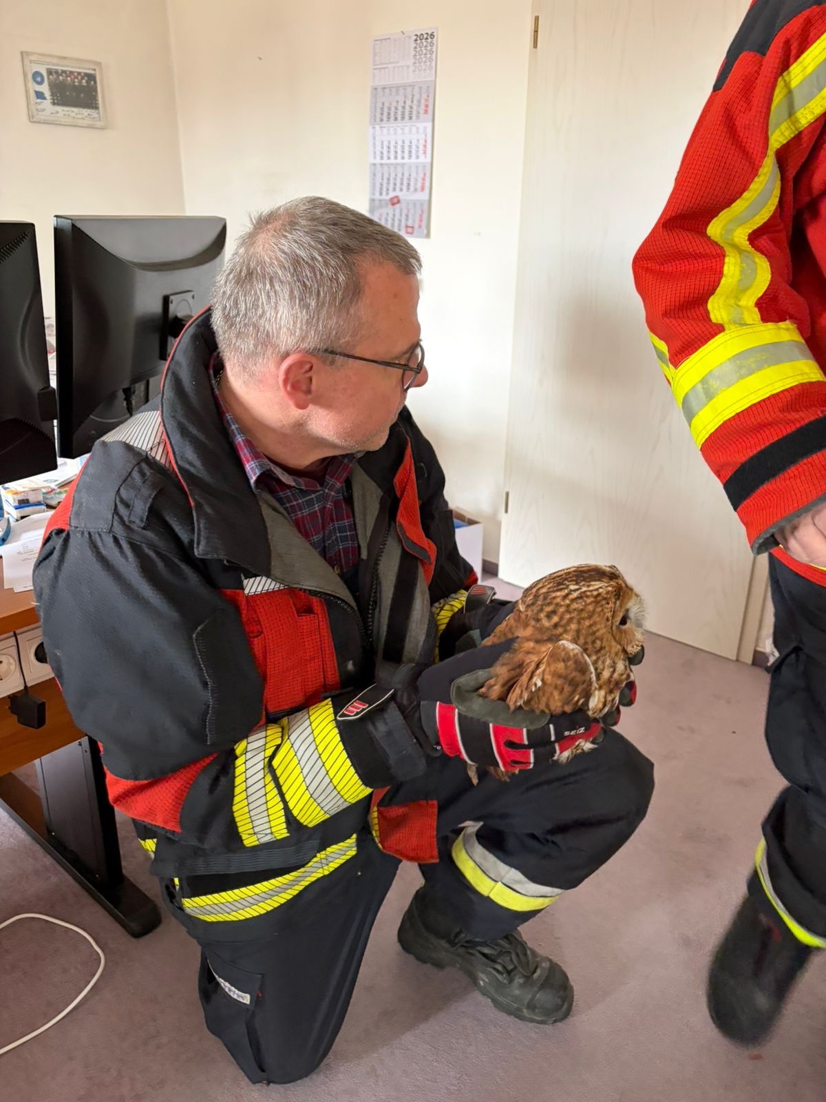 Am Sonntagmittag wurden wir zu einer Kleintierrettung in den Ernst Böhm Weg alarmiert. Eine Anwohnerin hatte der Leitstelle mitgeteilt, dass sie der Meinung sei, dass sich eine Eule oder ein Kauz in ihrem Kamin befinden würde. Nach unserem Eintreffen an der Einsatzstelle konnten wir den Eindruck der Anwohnerin bestätigen. Wir öffneten die Kaminkehreröffnung und staunten nicht schlecht als uns gleich 2 Augenpaare ansahen. Wir befreiten die beiden Tiere aus ihrer beklemmenden Lage und holten uns Hilfe bei einer eilig herbeigerufenen Falknerin. Zusammen suchten wir einen Veterinär auf, der die Unversehrtheit der Käuze feststellte und auch der Meinung war, dass sich die Tiere in einem allgemein kräftigen und gesunden Zustand befinden würden. Die Falknerin nahm sich der Tiere an und lies sie am selben Abend noch frei.